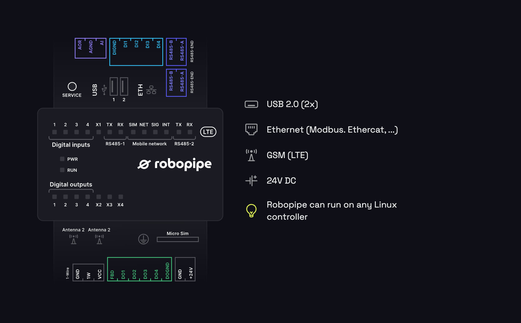 The controller features an LTE modem and a microSIM card slot to connect to the LTE wireless network.